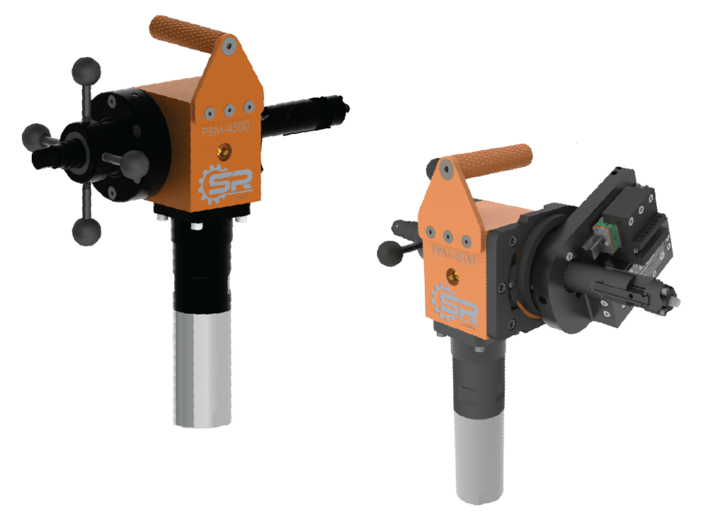 The PBM-4500 is a right-angled pipe (tube) end-prep machining tool designed to face, bevel, and counterbore for cutting end-prep configurations for welding. These operations can be performed separately or simultaneously. The current model uses a pneumatic powered motor. An optional electric motor is available upon request.